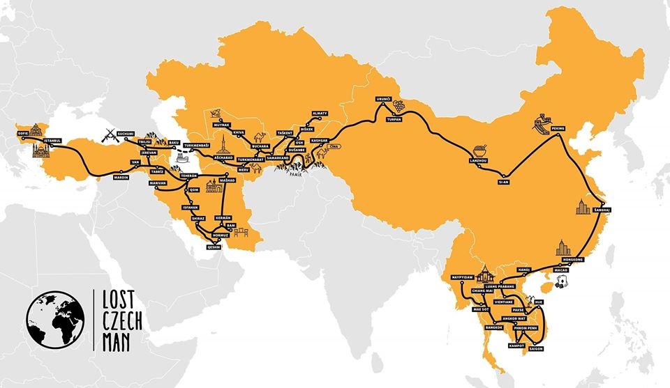 Jak probíhala cesta po Hedvábné stezce a dále? V září 2018 si zabalil malý batoh a bez využívání letadel a bez plánu se vypravil na cestu do neznáma. V bulharské Sofii se poprvé v životě postavil k dálnici a začal stopovat směr Turecko, přes které dojel do Íránu, kde strávil tři měsíce chozením a objevováním bývalé Perské říše. Začátek roku 2019 trávil pod Kavkazem v Arménii, Gruzii a Ázerbájdžánu a navštívil i jedno z nejzajímavějších míst bývalého Sovětského svazu, kterým je neuznaná republika Abcházie. Lodí přes Kaspické moře doplul do Turkmenistánu, který se pravidelně umisťuje mezi nejméně navštěvovanými zeměmi na světě. Po stopách dávných karavan projel Uzbekistán a Kazachstán a prošel nebeské hory Ťan-šan v Kyrgyzstánu. V Tádžikistánu poté pěšky prošel pohoří Pamír na hranici s Afghánistánem a Čínou. Po více jak osmi hodinovém výslechu poté překročil hranice do Číny a doputoval do bájného města Kashgar ze kterého přes pouště Taklamakan a Gobi doputoval až do císařského města Xian, kde po jedenácti měsících ukončil svou cestu po Hedvábné stezce.