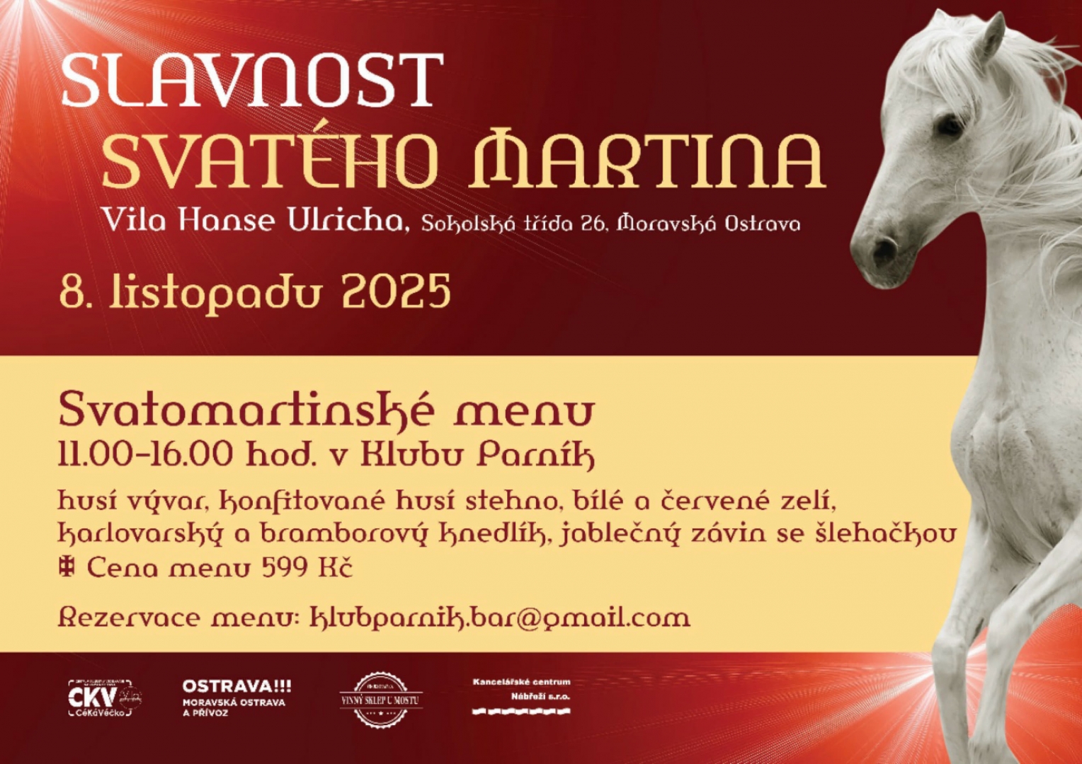 Husí hody v Klubu Parník: pečená husa s variací knedlíků a dvoubarevným zelím, doplněna o husí vývar a dezert, nabídka mladých vín.