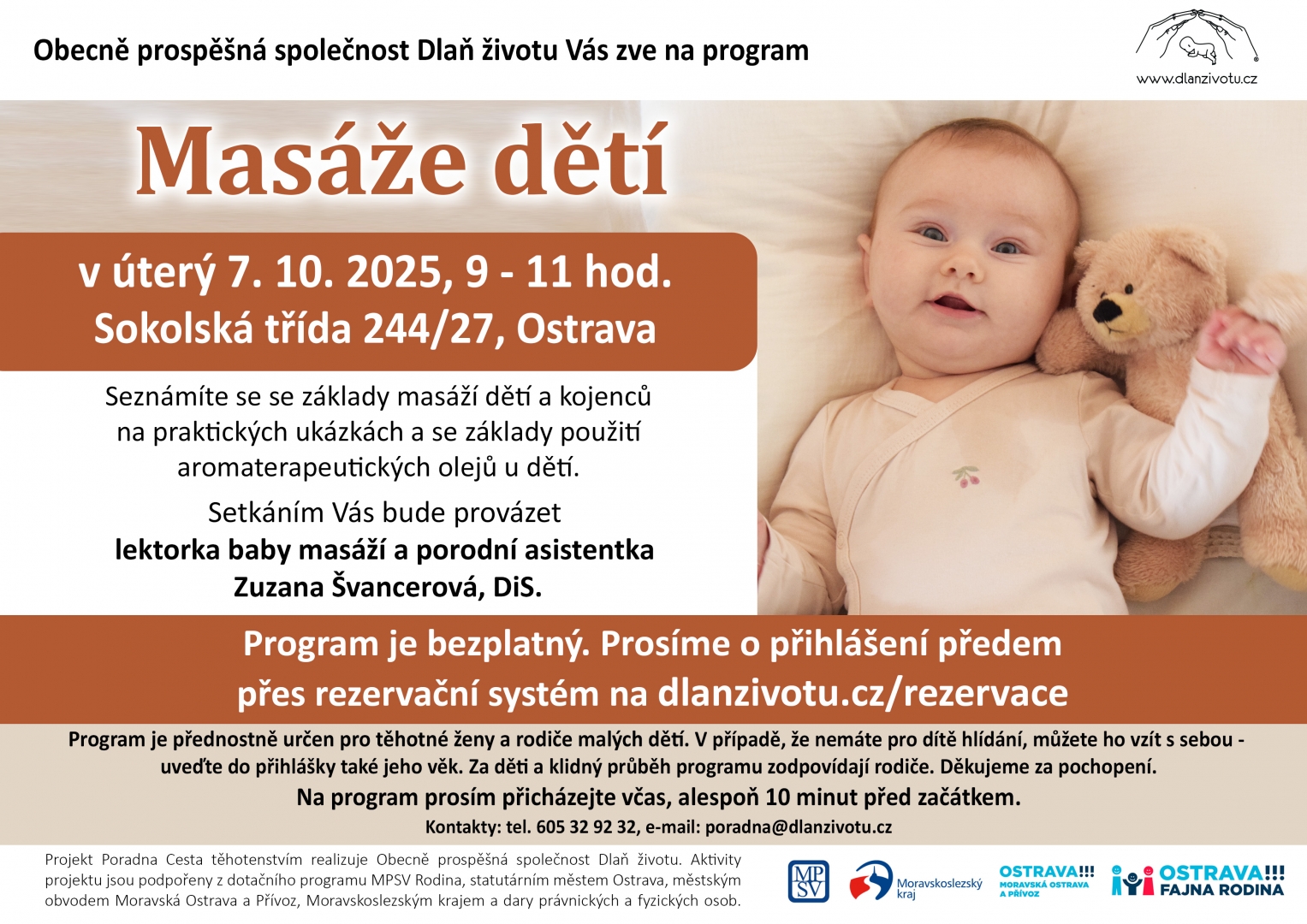Obecně prospěšná společnost Dlaň životu Vás zve na vzdělávací program pro rodiče Masáže dětí, který se koná v úterý 7. 10. 2025 od 9:00 do 11:00 hodin na Sokolské třídě 244/27 v centru Ostravy. Seznámíte se se základy masáží dětí a kojenců na praktických ukázkách (pokud děti máte, vezměte je s sebou, v případě těhotných žen nebo v případě, že dítě s Vámi na programu být nemůže, vezměte si s sebou např. panenku, abyste si mohli nacvičit masáže prakticky) a se základy použití aromaterapeutických olejů u dětí.