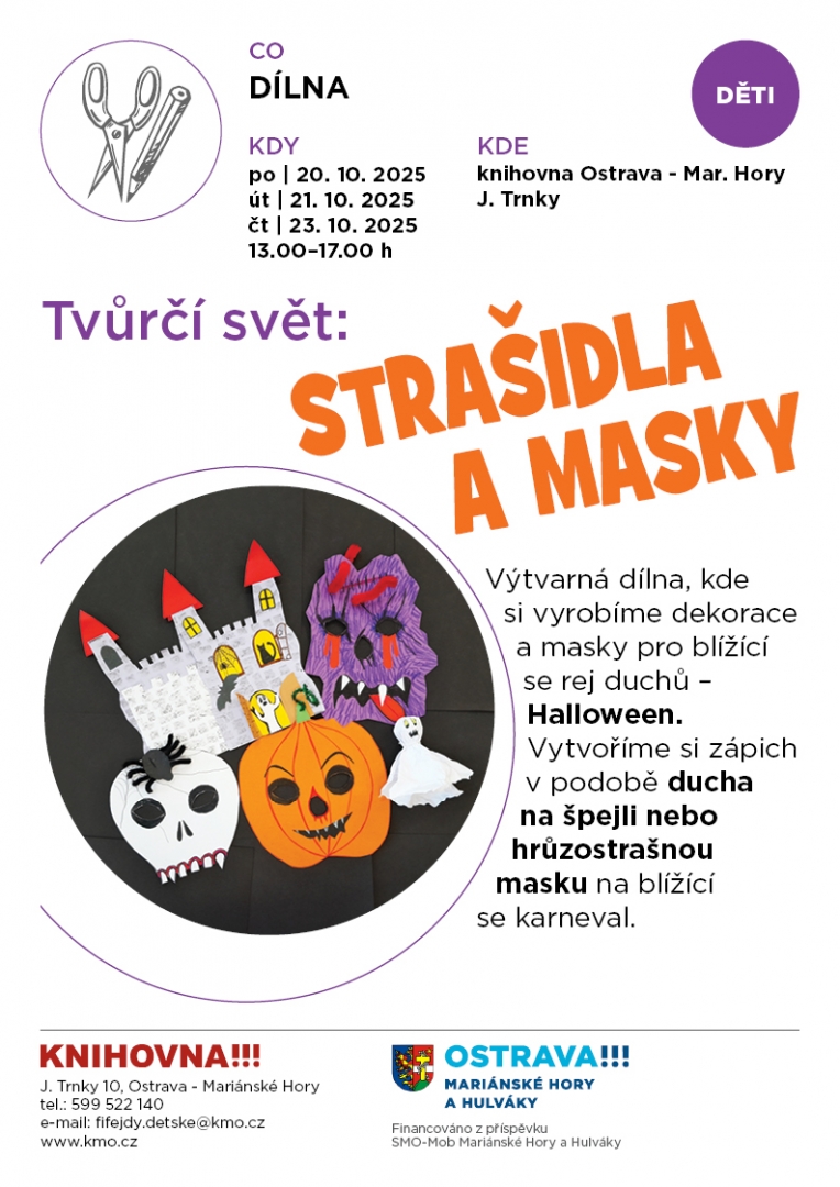 Výtvarná dílna, kde si vyrobíte dekorace a masky pro blížící se rej duchů - Halloween. Vytvoříte si zápich v podobě ducha na špejli nebo hrůzostrašnou masku na blížící se karneval.