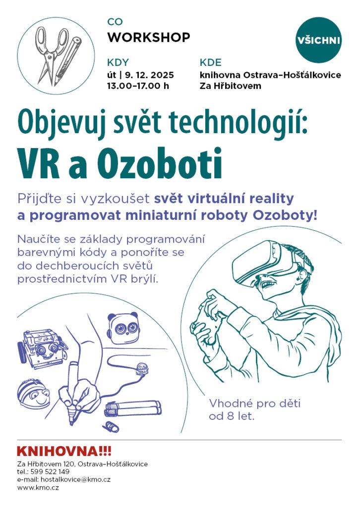 Milé děti, milí rodiče, prarodiče, přijďte si vyzkoušet svět virtuální reality a programovat miniaturní roboty Ozoboty! Naučíte se základy programování barevnými kódy a ponoříte se do dechberoucích světů prostřednictvím VR brýlí. Srdečně zveme všechny zájemce od 8 let. Těšíme se na vás.