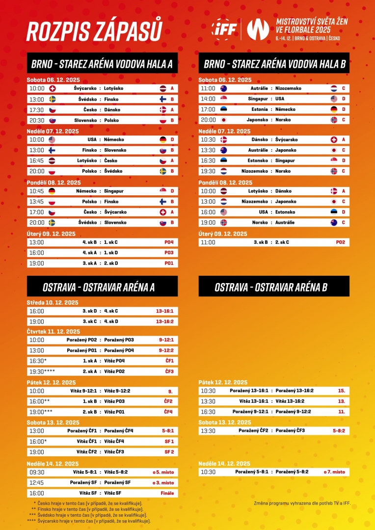 Florbalové mistrovství světa žen se vrací do České republiky po dvanácti letech. V pořadí již 15. šampionát žen hostí města Brno a Ostrava od 6. do 14. prosince 2025.