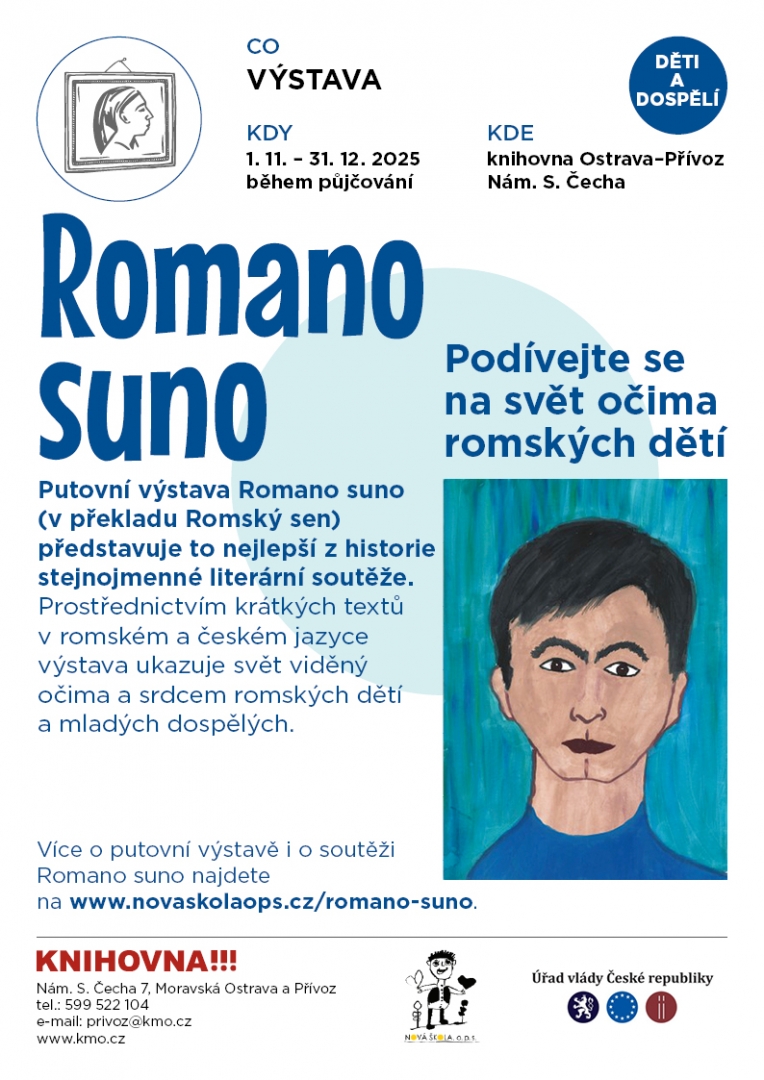 Putovní výstava Romano suno - Podívejte se na svět očima romských dětí (v překladu Romský sen) představuje to nejlepší z historie stejnojmenné literární soutěže. Prostřednictvím krátkých textů v romském a českém jazyce výstava ukazuje svět viděný očima a srdcem romských dětí a mladých dospělých. Více o putovní výstavě i o soutěži Romano suno najdete na www.novaskolaops.cz/romano-suno.