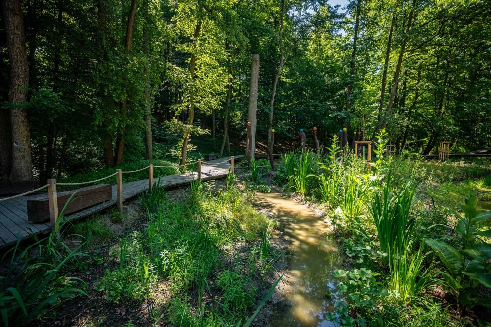 Scházet nebude ani další nový mobiliář – kládové lavičky, odpočinkové plošiny, pobytové platformy a sedací balvany. Děti jistě přivítají v blízkosti stezky opičí dráhu i interaktivní stezku balvanů. Zamýšlené prvky podpoří a rozvinou dětské hry v lese. „Nad stávajícím tokem bude umístěn dřevěný mostek. Doplněna budou také dvě schodiště. Jedno z nich propojí nedaleký běžecký okruh a stezku Cesty vody. I desítky let užívaný běžecký okruh v délce 907 metrů byl letos obnoven. Původní povrch byl místy degradován, nově je tvořen směsí pilin a písku. Dojde k šetrnému zpřístupnění špatně prostupného lesního porostu, s důrazem na zachování zdejší bioty. V blízkosti stezky vzniknou tůně pro podporu trvalého výskytu vody, její retence a vsaku. Tůně budou neprůtočné, optimalizující vodní režim, přispívající k zadržování vody v krajině, podpoře biodiverzity území, pomohou zachytit vodu z přívalových dešťů, která díky tomu neodteče z území,“ uzavírá Aleš Boháč, náměstek primátora pro životní prostředí.