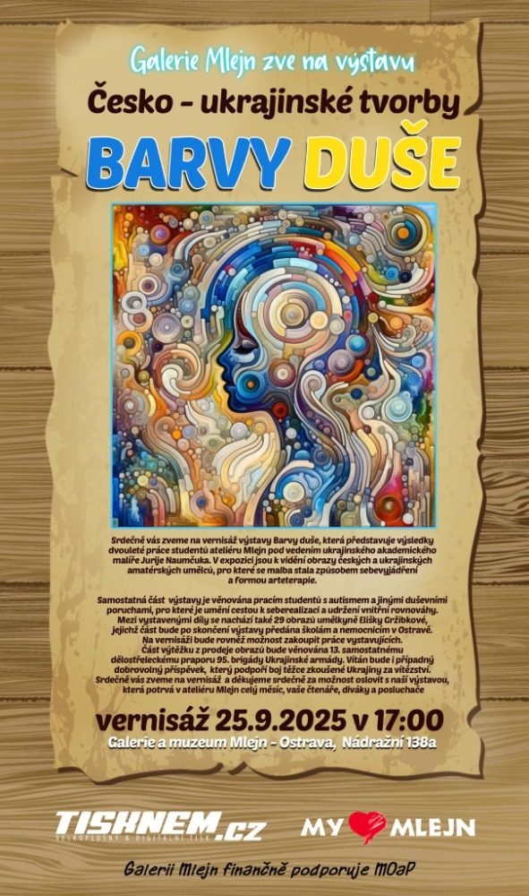 Originální výstava byla zahájena ve čtvrtek 25 září v Galerii Mlejn na ostravské Nádražní ulici. Nese jméno Barvy duše a jejími autory je 23 českých a ukrajinských amatérských tvůrců. Díla, kterých je přibližně 120, jsou prodejná, výtěžek z prodeje míří na pomoc bojující Ukrajině.