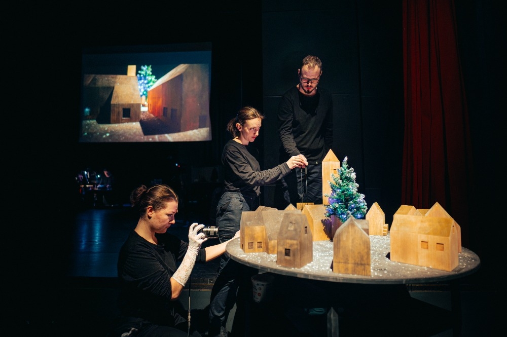 „Samotná postava Sněhové královny se v naší inscenaci vůbec neukáže – vnímáme ji právě skrz pohled kamery, jako oko predátorky číhající na svou oběť. Využíváme filmového postupu subjektivní kamery, při němž se kamera stává jednou z postav,“ popisuje režisér Jakub Maksymov, který má s puppet cinema bohaté zkušenosti z domácích i zahraničních projektů, například z inscenací Chronoskřítkové (Bratislavské bábkové divadlo), Kubik (Kindertheater Fraunhofer, Mnichov), Frankenstein (Divadlo Komedie Praha) či A jako Antarktida (Bábkové divadlo Žilina).